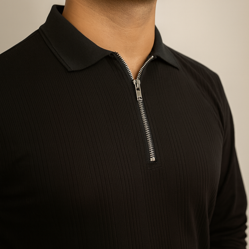 The ribbed collars and sleeves add a touch of classic sophistication, while the silver brass zip provides a contemporary twist. This unique combination creates a harmonious blend of tradition and modernity.